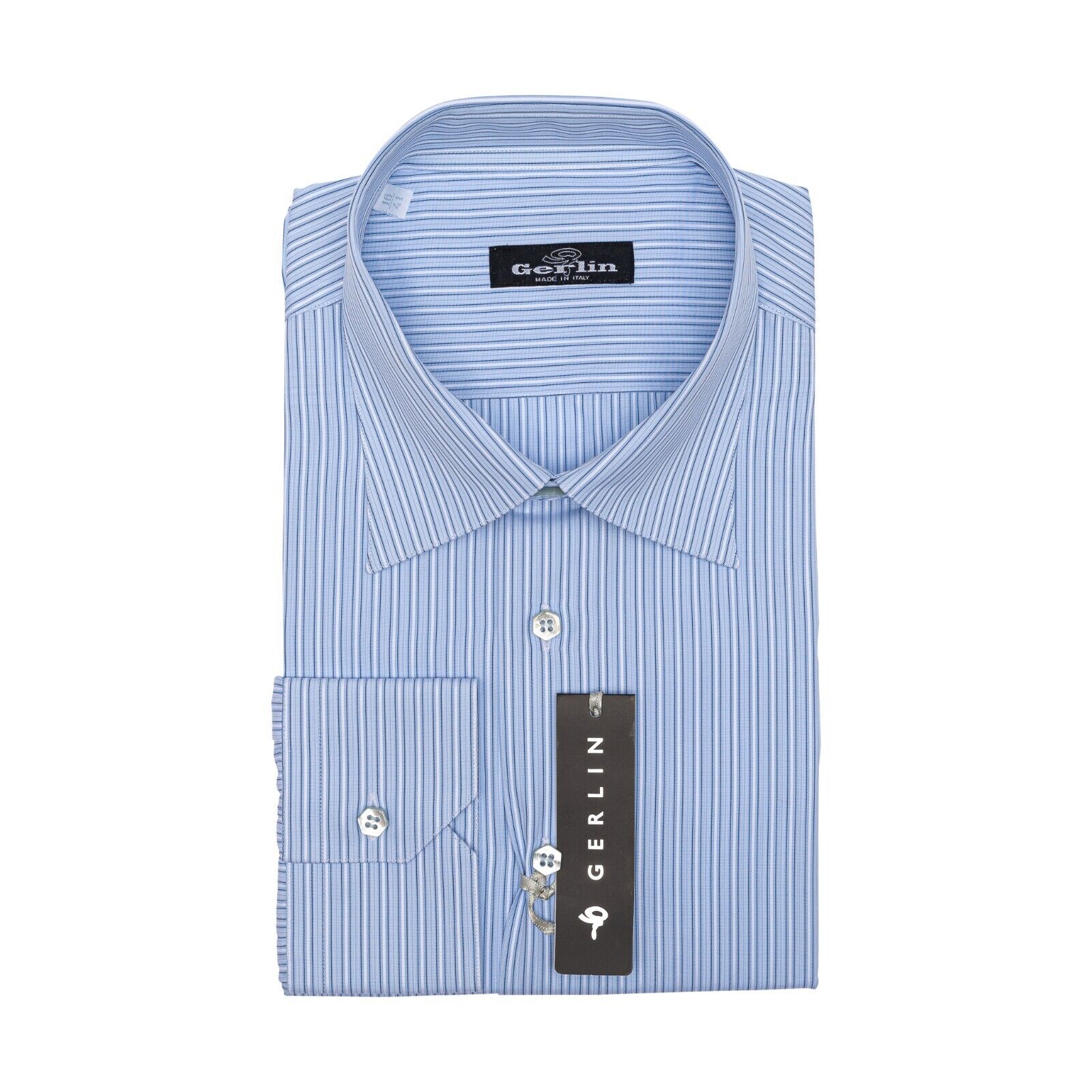 Elevate your wardrobe with the luxurious Gerlin dress shirt, a testament to Italian craftsmanship and sartorial elegance. Crafted from 100% cotton, this blue striped shirt ensures comfort without compromising on style. The classic fit, size 16 (41), is designed to flatter with a timeless spread collar and standard cuffs, embodying the perfect blend of tradition and sophistication. Every detail, from the jacquard weave to the button closure, reflects an attention to quality and design. This limited edition piece, made in Italy, is a true collector's item for those who appreciate the finer things in life. Whether for a special occasion or to elevate your daily attire, this Gerlin shirt is an investment in enduring style.