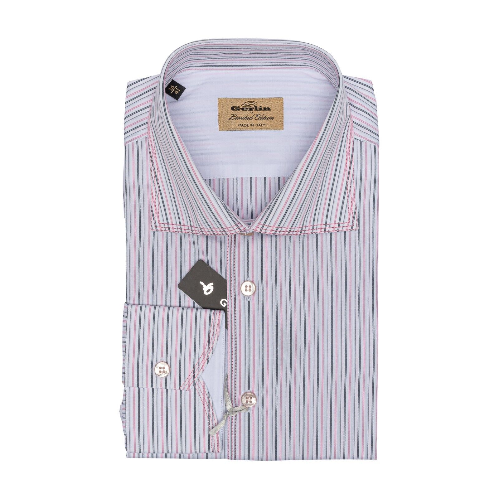 Elevate your wardrobe with the luxurious Gerlin dress shirt, a testament to classic Italian style and craftsmanship. Expertly tailored in Italy, this size 16 (41 cm) shirt features a timeless striped pattern in a crisp white color, perfect for any formal or business occasion. The long sleeves and spread collar enhance the shirt's sophisticated silhouette, while the cotton material ensures comfort and breathability. Attention to detail is evident in the shirt's triple-stitched Alumo cotton fabric, offering both durability and a smooth finish. With a regular fit that caters to a classic body type, this limited-edition piece is a versatile addition to a discerning gentleman's collection. The button closure and Italian-themed design round out the shirt's elegant appeal.